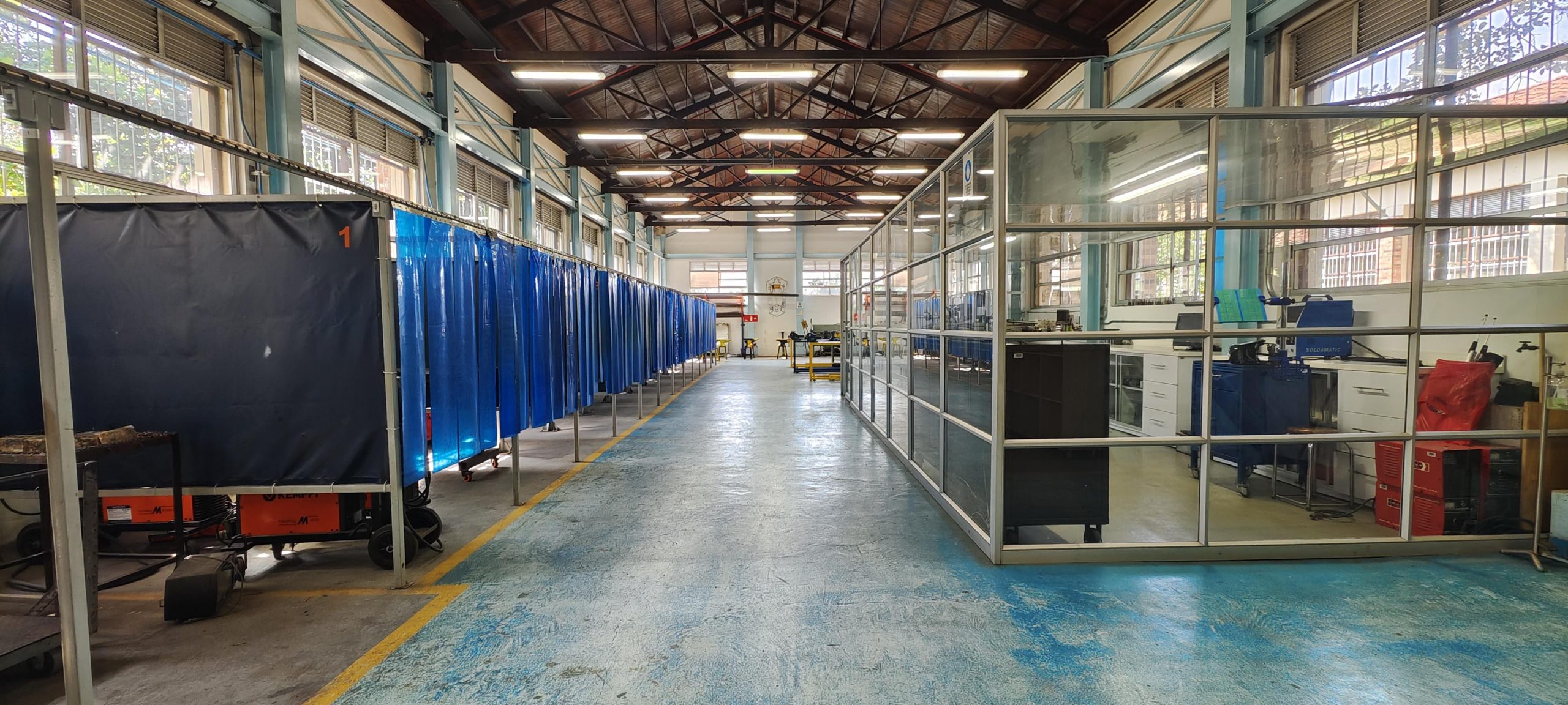 • 3 cabinas de trabajo con equipo de soldadura tig de 230 amperios, que cuenta con su mesa de trabajo y elementos de seguridad.
