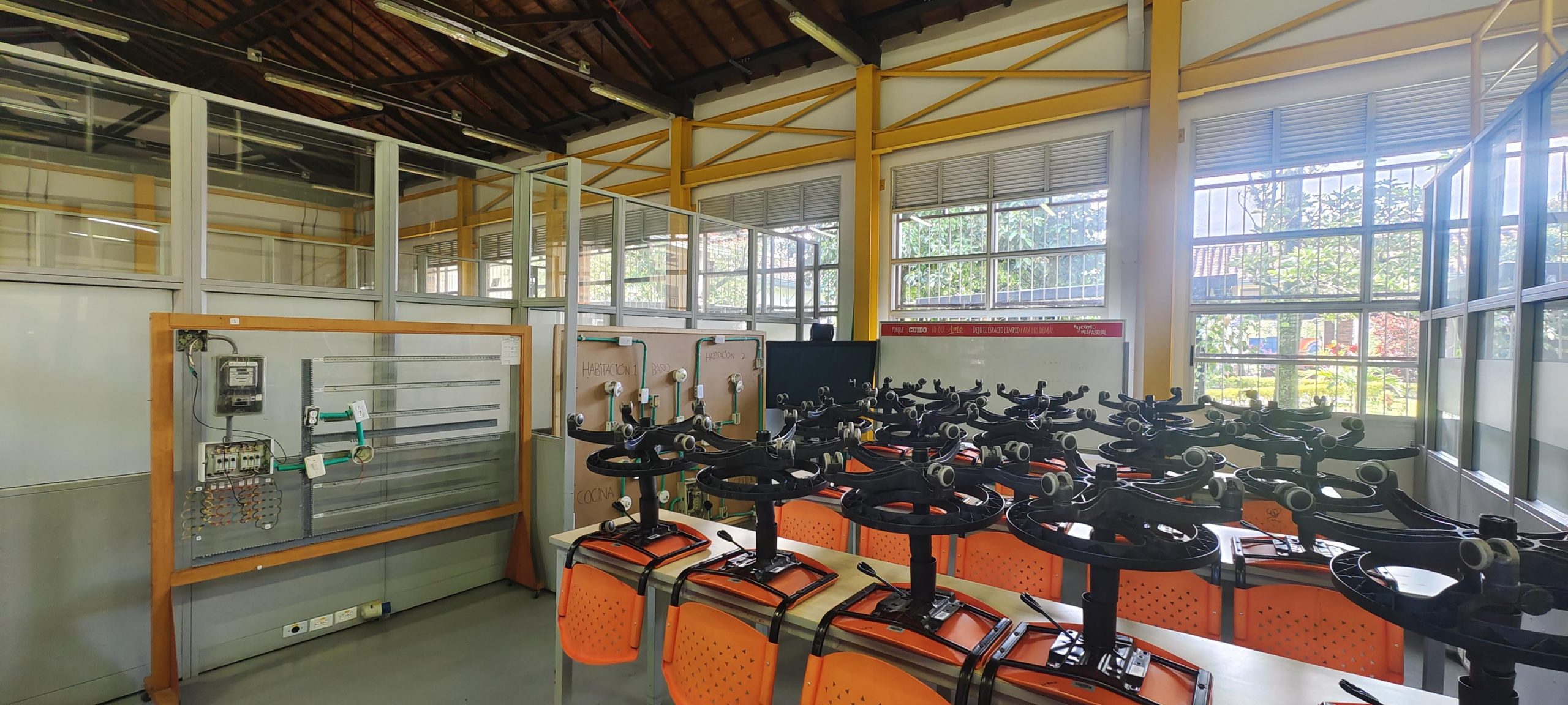 El laboratorio cuenta con varios módulos didácticos con los elementos eléctricos básicos comunes utilizados en instalaciones eléctricas domiciliarias, estos módulos tienen tomacorrientes, interruptores eléctricos, tubería, cables conductores, bombillas entre otros elementos, que permiten a los estudiantes realizar conexiones e instalaciones eléctricas requeridas para las prácticas.