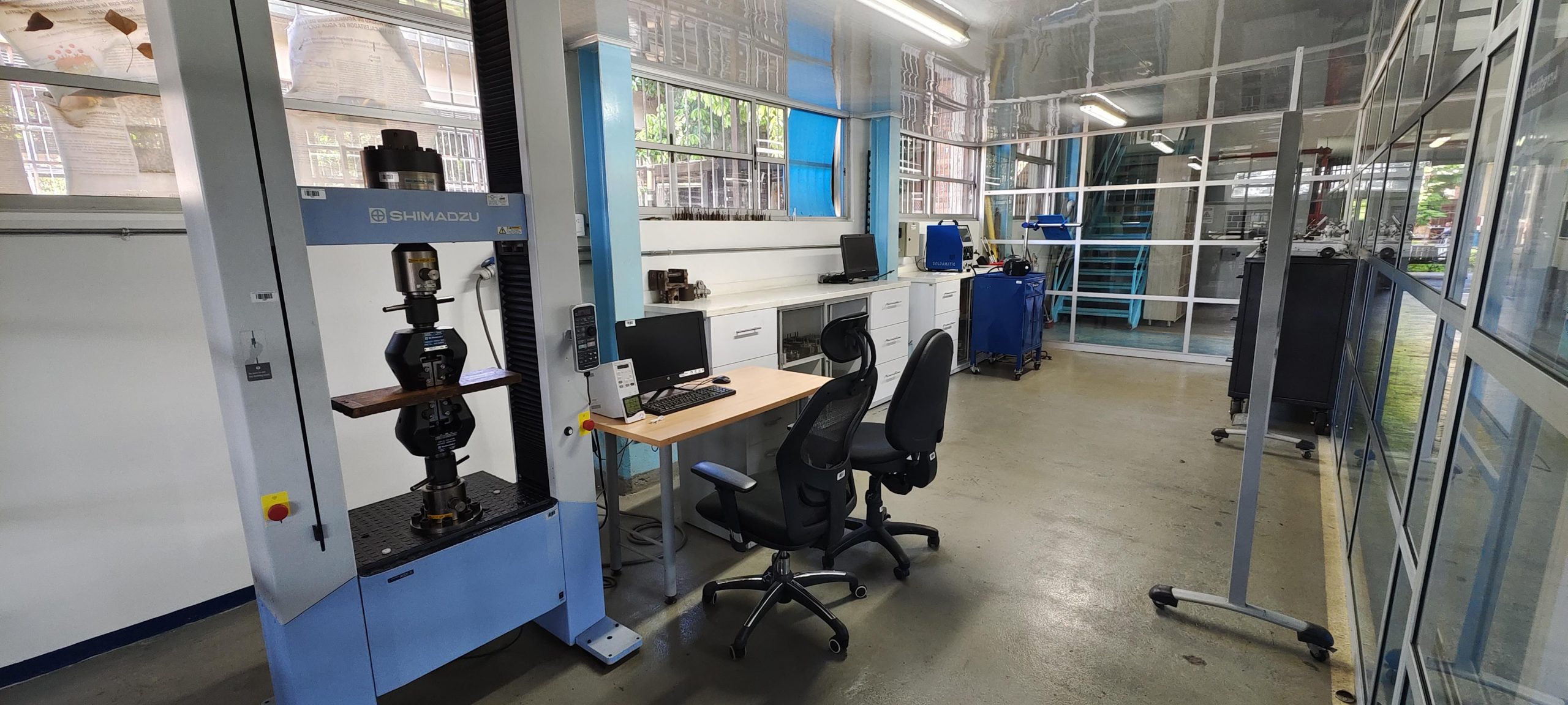 Está equipado con una máquina universal para la realización de ensayos mecánicos, que tiene un computador para el control de la máquina y registro de los resultados del ensayo, además con las herramientas para la sujeción de las probetas.