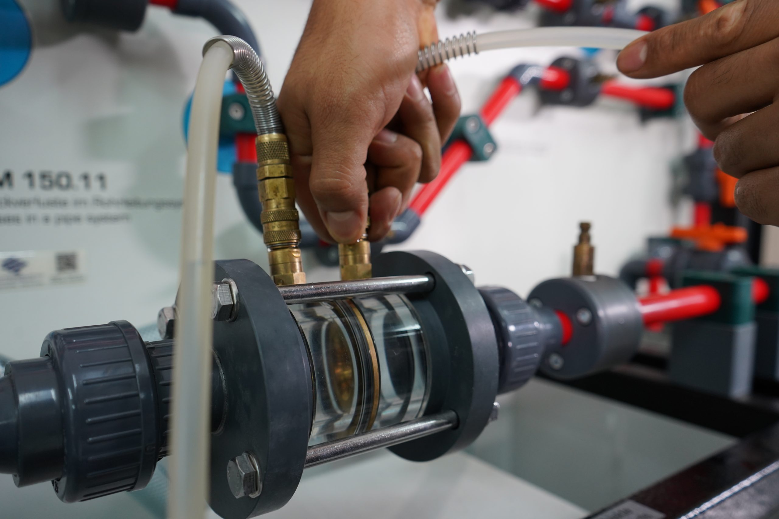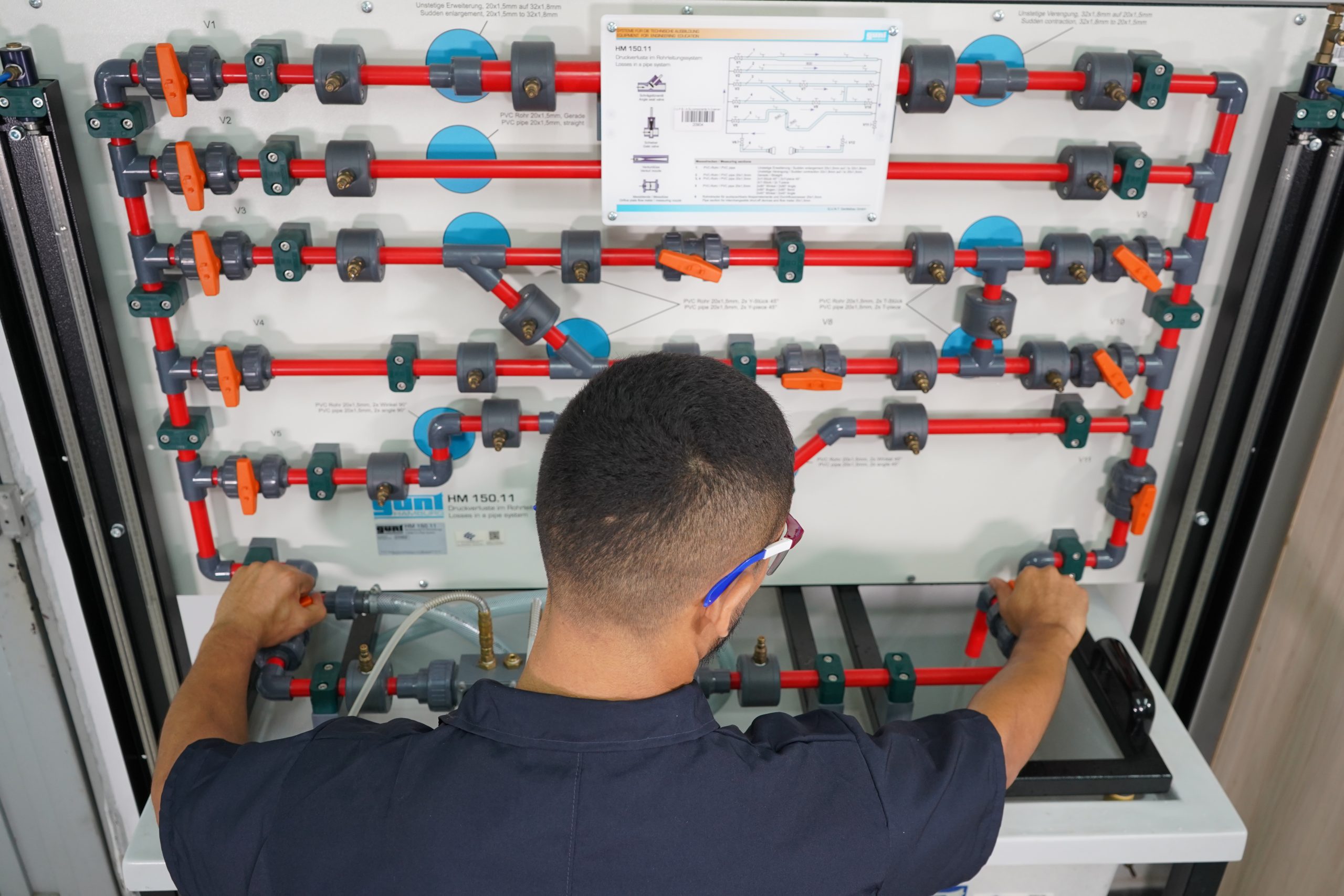 - Módulo de pérdida de carga constituido por un sistema de tubería unido con diferentes accesorios que permite estudiar y calcular las pérdidas de energía que se producen en un fluido en movimiento a causa de la fricción con la tubería y accesorios.