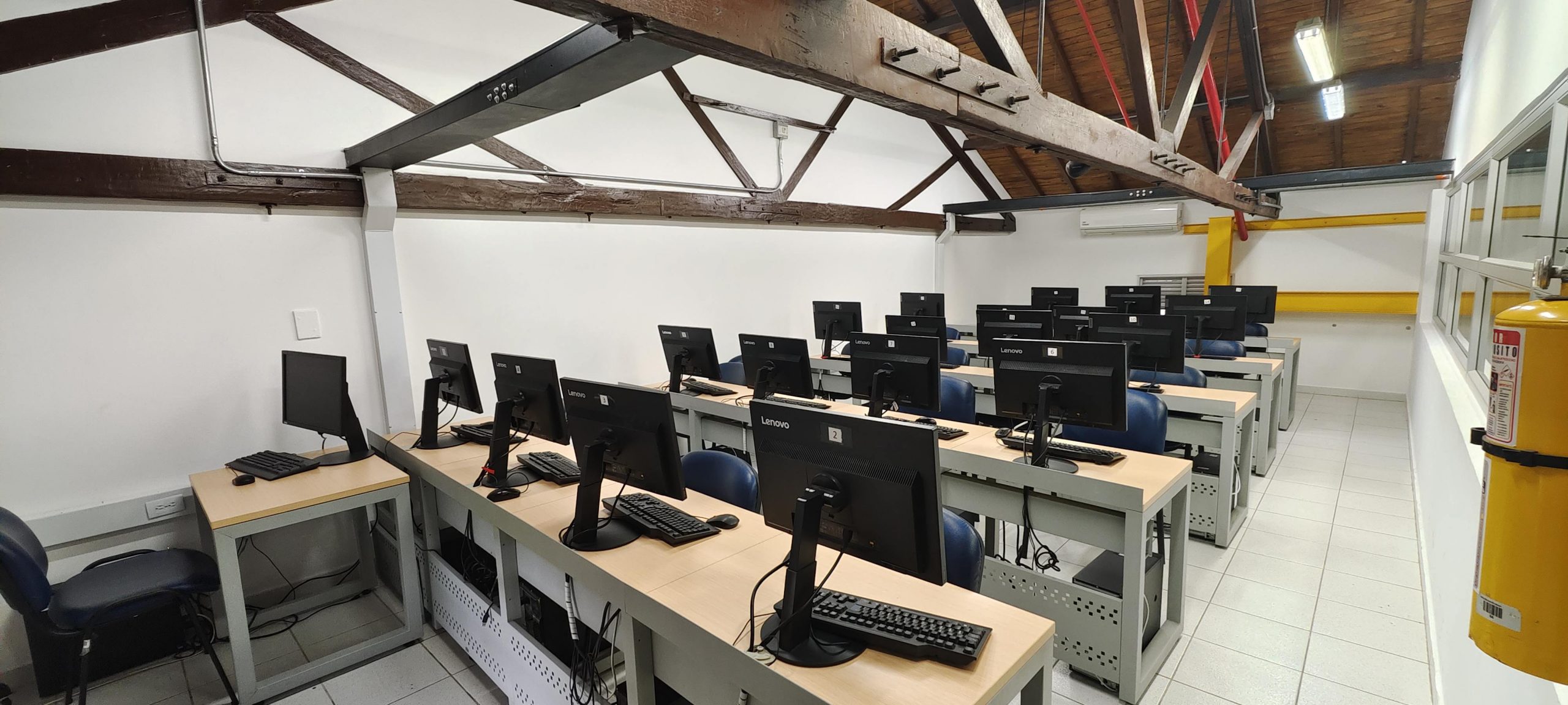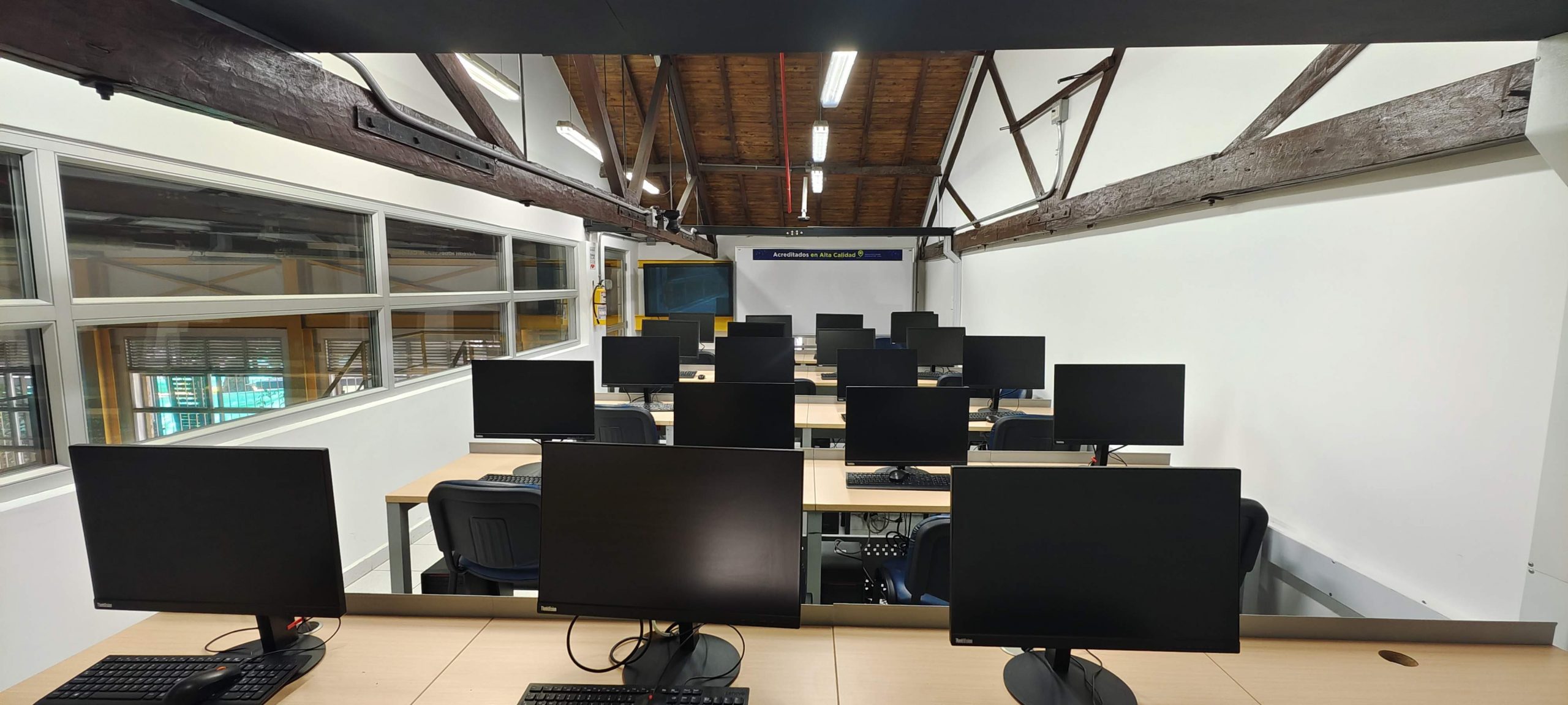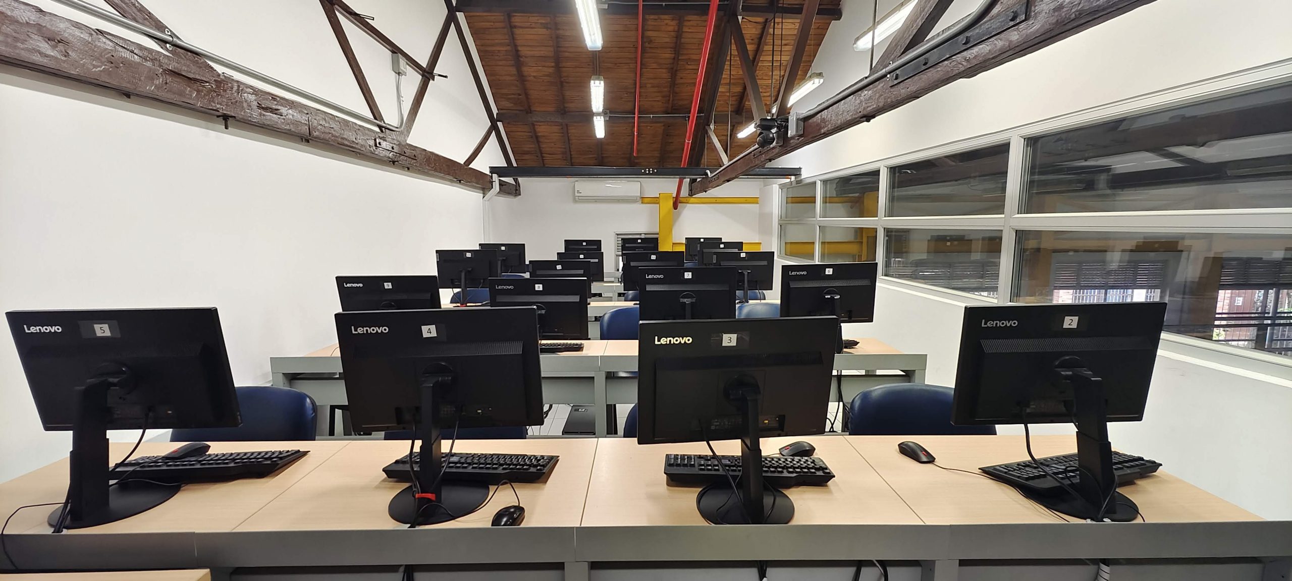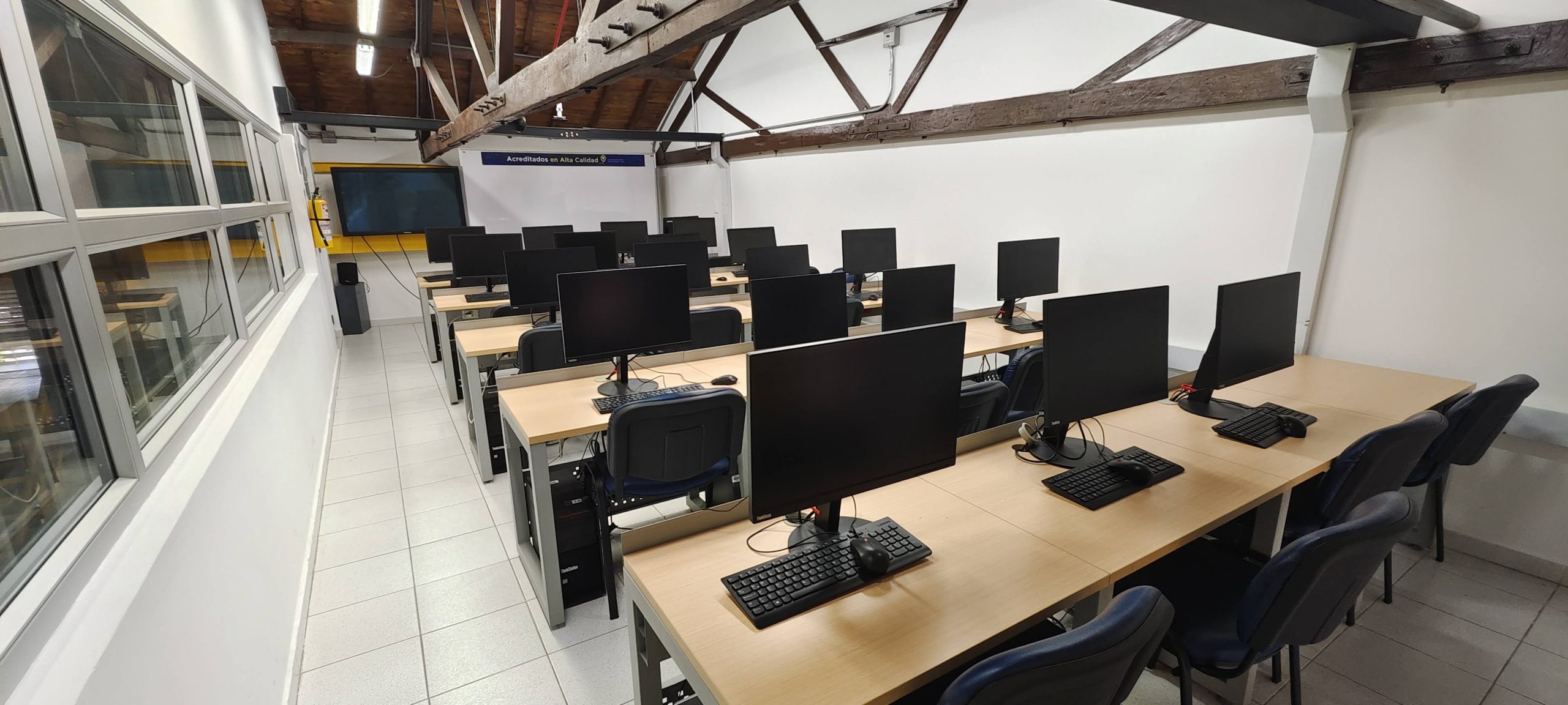 El laboratorio está dotado con 20 puestos para estudiantes con computadores con los softwares necesarios para la enseñanza de la simulación de procesos eléctricos.