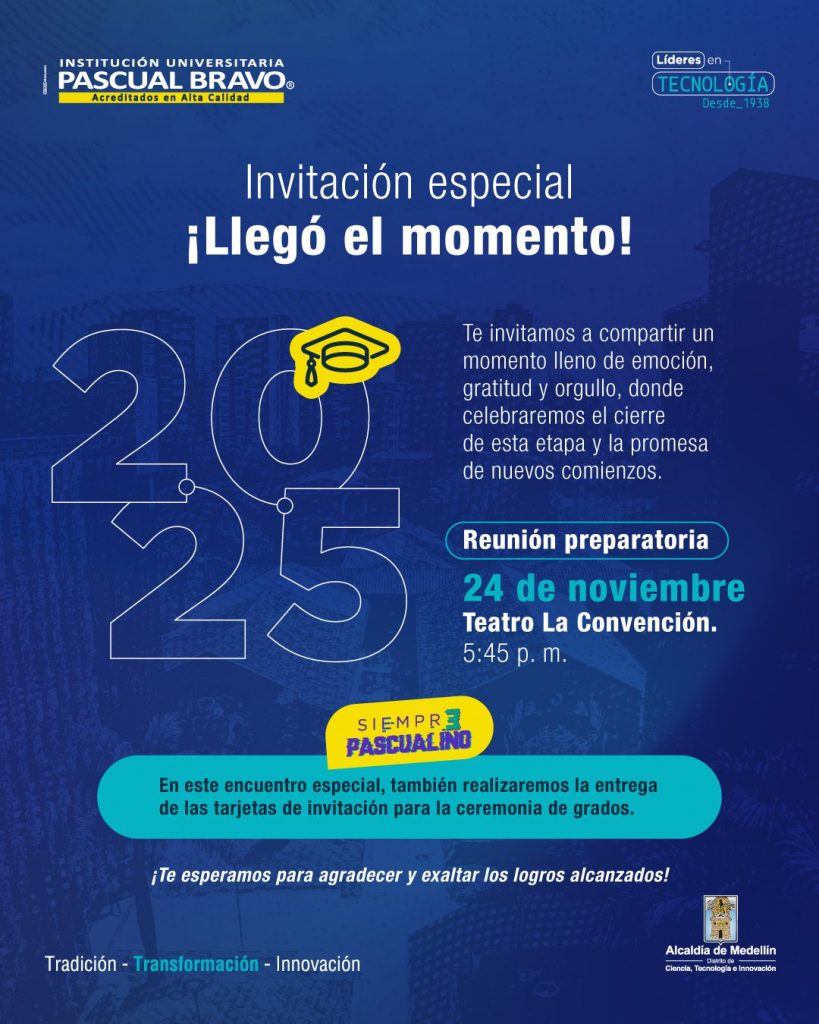 La Institución Universitaria Pascual Bravo invita a los futuros graduandos a participar en la reunión preparatoria de grados, que se realizará el lunes 24 de noviembre, a las 5:45 p.m., en el Teatro La Convención.